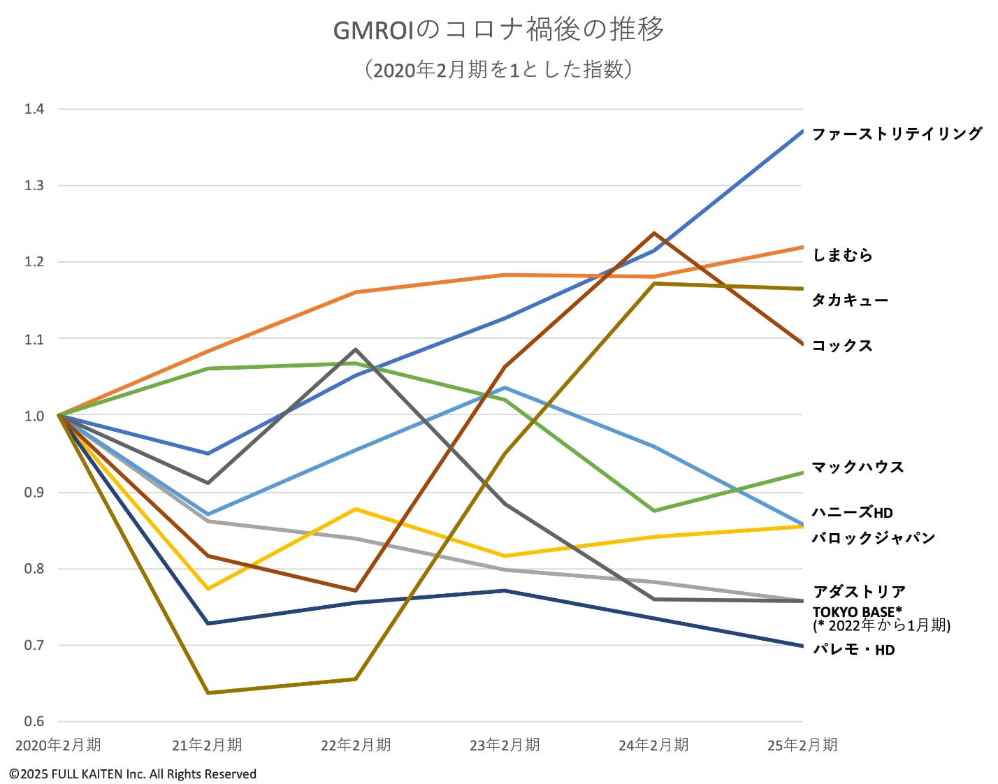 この章では在庫効率について考えます。次のグラフは各社のGMROI(商品投下資本粗利益率)について、コロナ禍直前の2020年2月期を1とした指数で6年間の推移をまとめています。