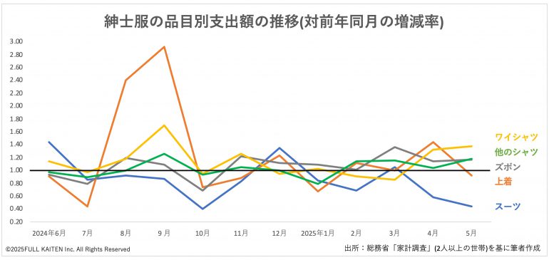 一方、スーツは振るいません。2024年7月以降、12月と25年3月を除いて前年割れでした。