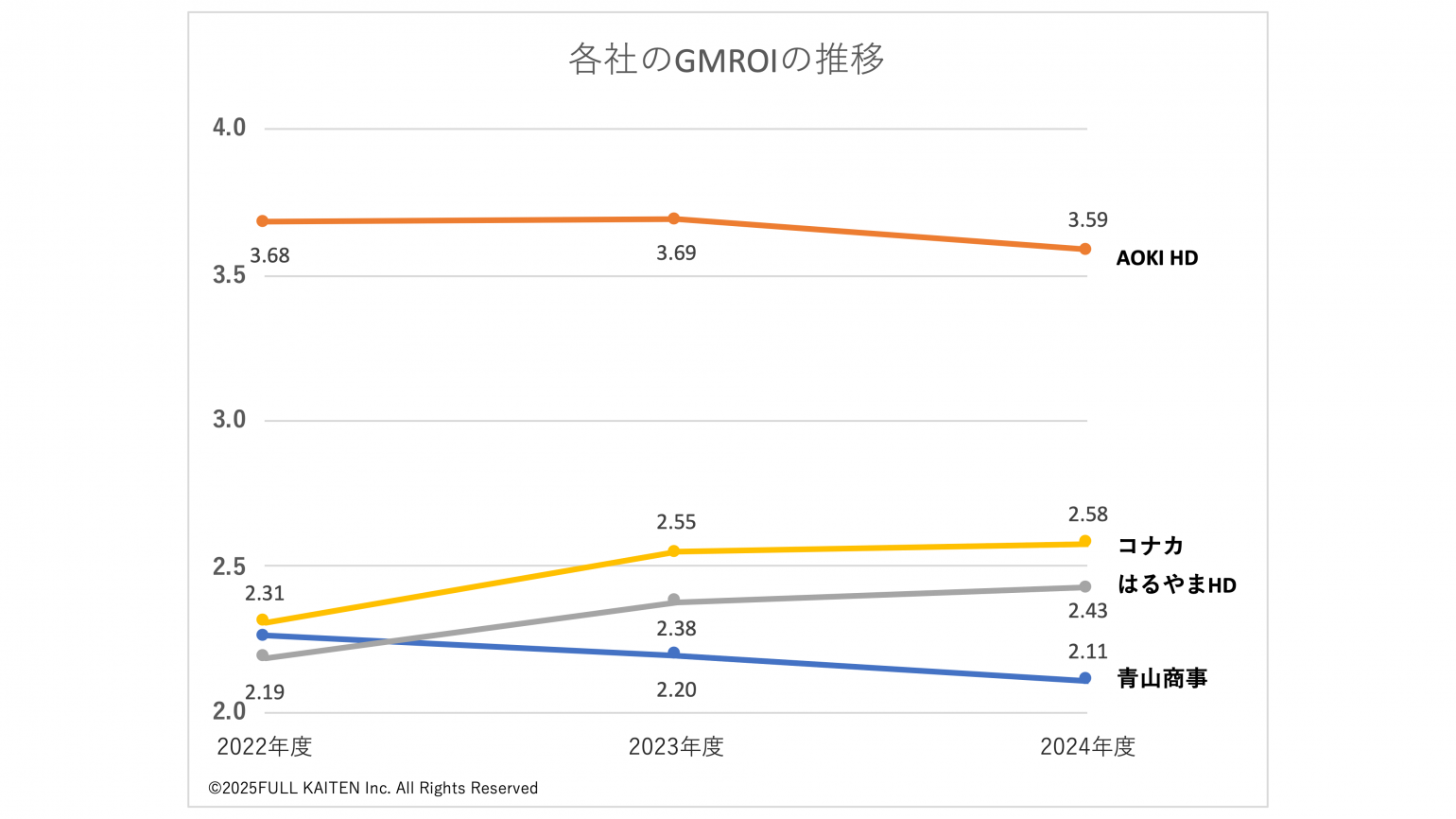 売上高で業界首位の青山商事はGMROIは右肩下がりとなっています。AOKIホールディングスも2022年度、23年度と横ばいでしたが、直近の24年度(25年3月期)は若干ですが低下してしまいました。