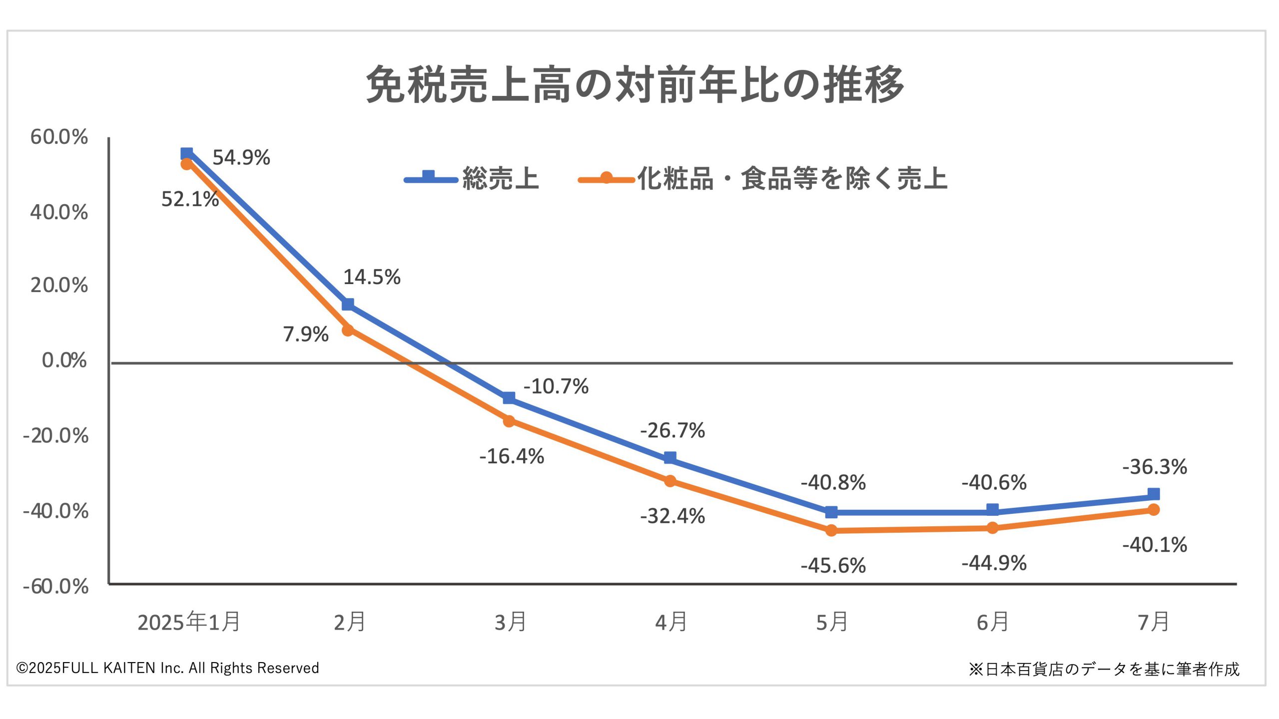 2025年3月から5カ月連続で前年割れとなっていることが分かります。しかも減少率は4割前後で推移しており、大変大きな減収です。そして、消耗品(化粧品・食品等)を除いた売上高は全体よりも減少幅が数ポイント大きくなっています。