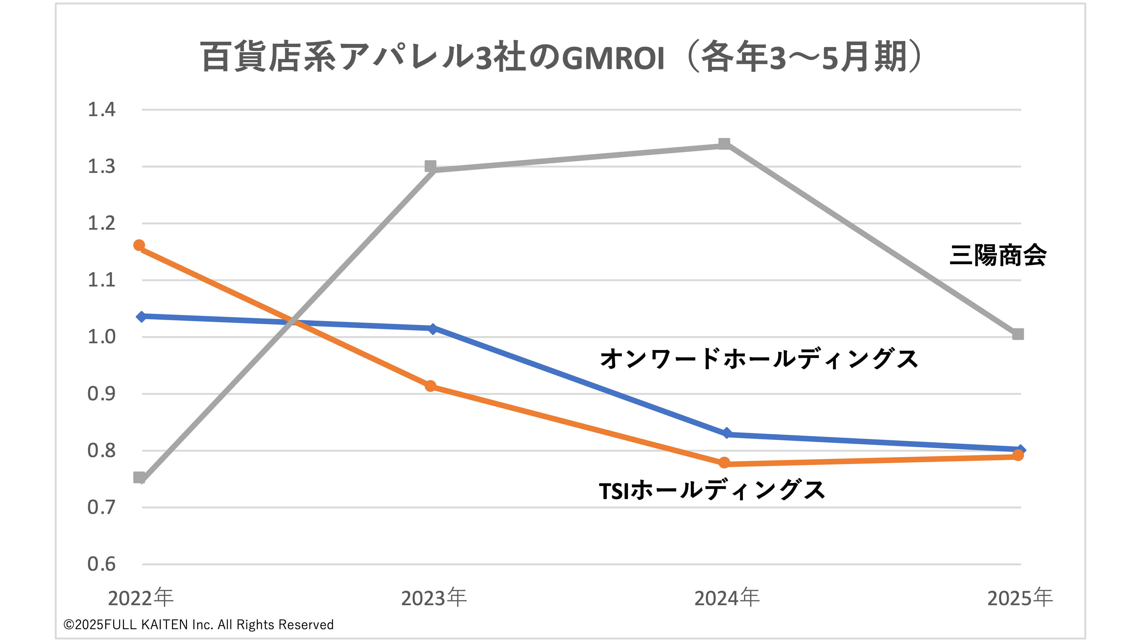 以上を踏まえ、3社の在庫効率を比較してみましょう。次のグラフは、各社の3〜5月期のGMROI(商品投下資本粗利益率)について、2022年から25年まで4年間の推移を示したものです。