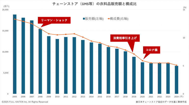 2005年に1兆8833億円だった販売額は右肩下がりで、2024年には6645億円まで減ってしまいました。構成比も2005年の13.3%がピークで、2024年には5.1%に下がっています。