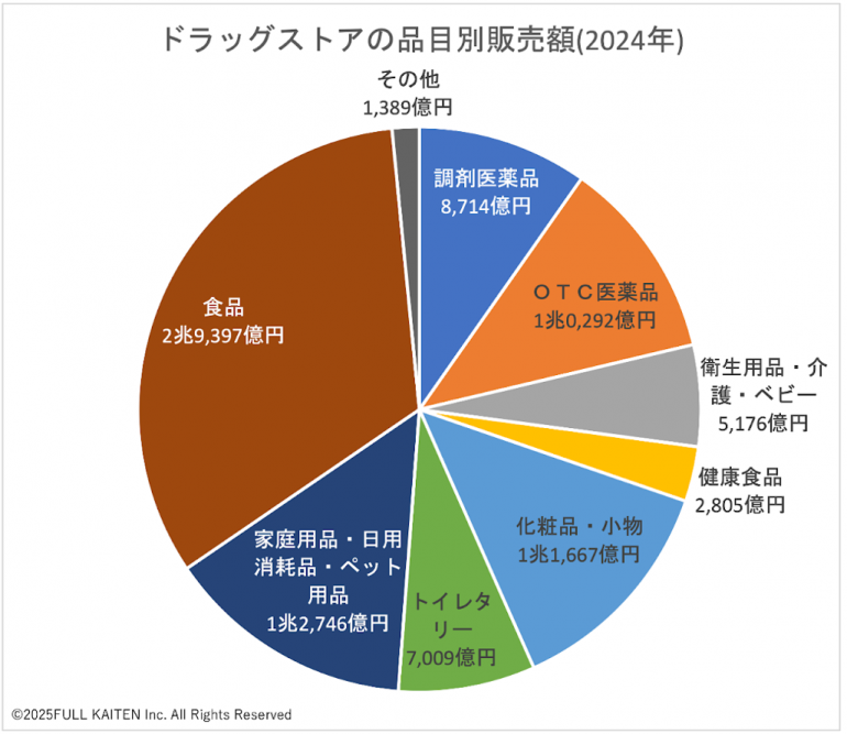 ここで勘の良い方はお気づきかと思います。ドラッグストアと収益構造がそっくりなのです(割安な食品で集客し、化粧品や調剤で利益を上げる)。経済産業省の商業動態統計調査によると、ドラッグストアの品目別販売額で最も割合が大きいのは食品で、販売額全体の33%(2024年)を占めています(下グラフ)。