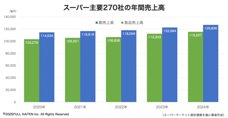 2024年の食品(生鮮、惣菜、日配、一般食品)売上高は11兆5527億円と前年から2.9%増加しました。ただし、24年1年間の物価上昇率に鑑みれば、食品小売の市場規模は実質的に頭打ちです。