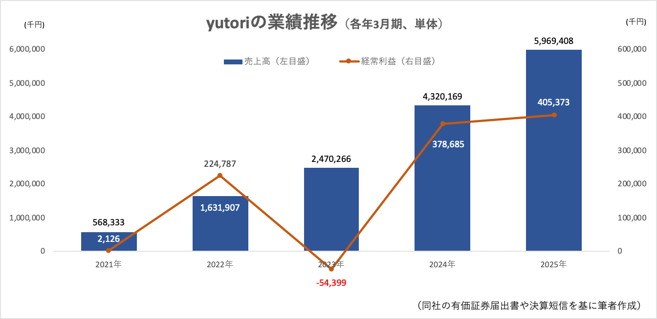 次にyutoriです。自ら企画して生産を発注し、巧みなSNSマーケティングを駆使して消費者に届けるD2Cの代表格です。2018年の設立から23年12月に東証グロース市場に株式上場するまで、わずか5年8カ月しか要しなかったことが当時大きな注目を集めました。そんなyutoriの直近5ヵ年の業績は下グラフのとおりです(単体決算)。