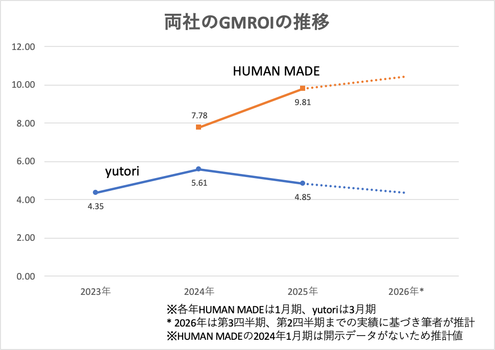 最後に、小売経営の根幹をなす「在庫効率」の観点からヒューマンメイドとyutoriを比較してみましょう。ここで用いるのがGMROI(商品投下資本粗利益率)という指標です。以下の計算式で求められます。