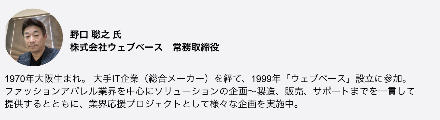 アパレル業界にとって最も深刻な課題である在庫管理について、約20年に渡りファッション・アパレル業界へソリューションを提供している、株式会社ウェブベース常務取締役の野口様にお話をお伺いしました。