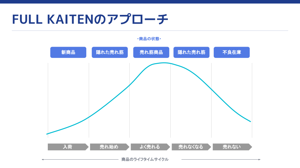 在庫を利益に変えるクラウドシステム「FULL KAITEN」は、在庫データを活用してEC・店舗・倉庫、全ての在庫をAIで予測・分析し、商品力はあるのに眠っている在庫を明らかにすることが可能です。