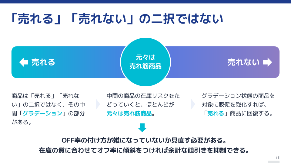 - 売れなくなってきた→深いOFF率にして売り切っていく