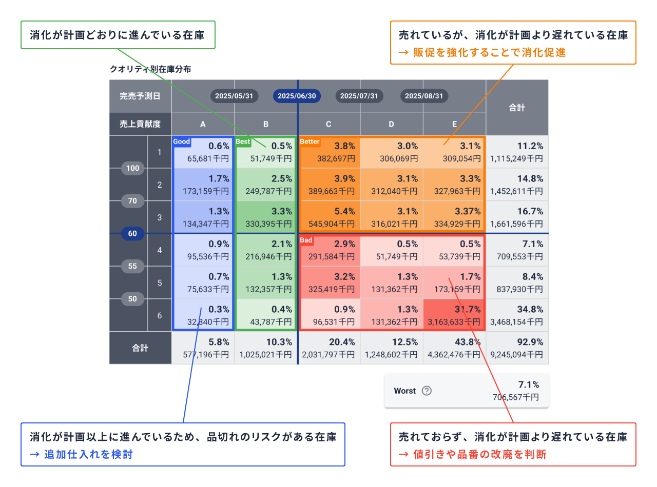このため利用者は日々移り変わる在庫の特性(コンディション、リスク等)を適時に把握できます。さらに、把握した課題を改善するために必要な具体的なアクションを利用者に提示するUIとなっています。