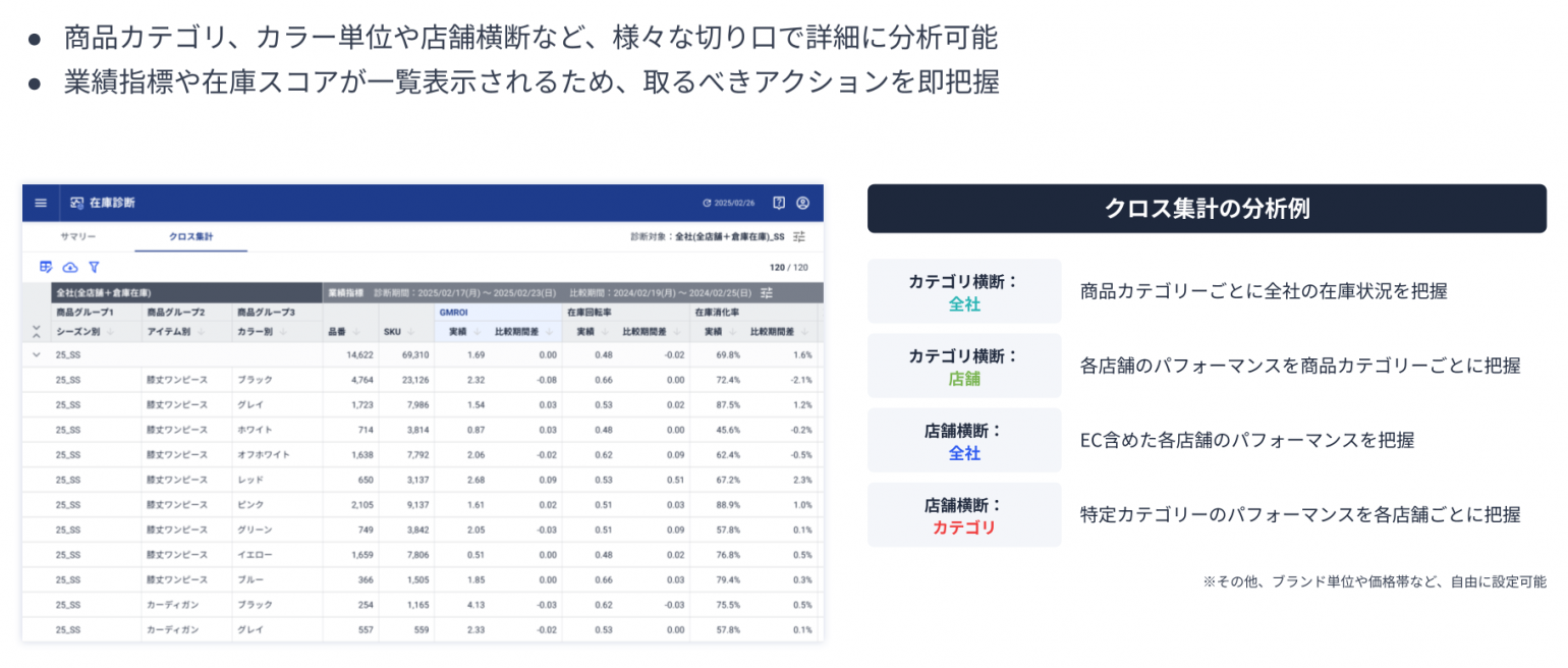 - 多様な切り口で分析:「クロス集計」機能を使うと商品カテゴリ、カラー単位、店舗横断など、様々な切り口で詳細な分析が可能です。クロス集計した在庫に関して、業績指標や在庫スコア(コンディション、リスク等の特性)が一元表示されるため、利用者は取るべきアクションを即座に把握できます