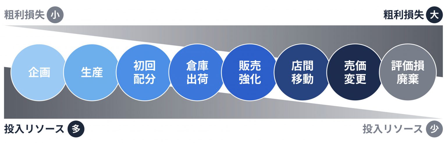 小売をはじめとした在庫ビジネスには、業務フローの各工程において下図のような投入リソース(人的、資金的な経営資源)と粗利毀損の関係があります。