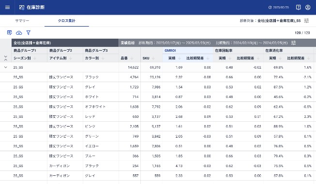 商品カテゴリやカラー単位、店舗横断など、自由な切り口で詳細に分析することが可能です。