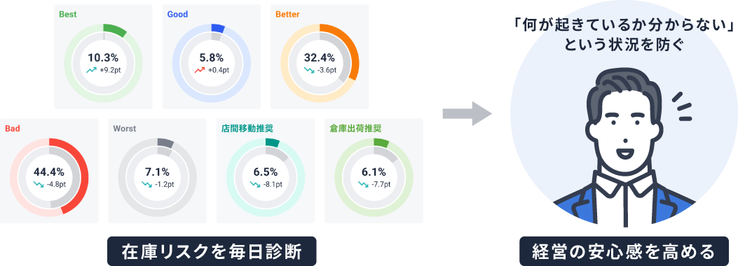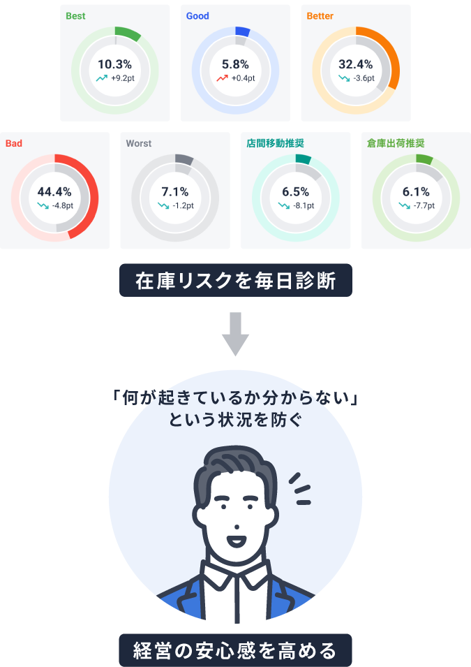 売上や在庫などのデータを用いて全社、店舗、カテゴリごとの在庫リスクを自動診断し、